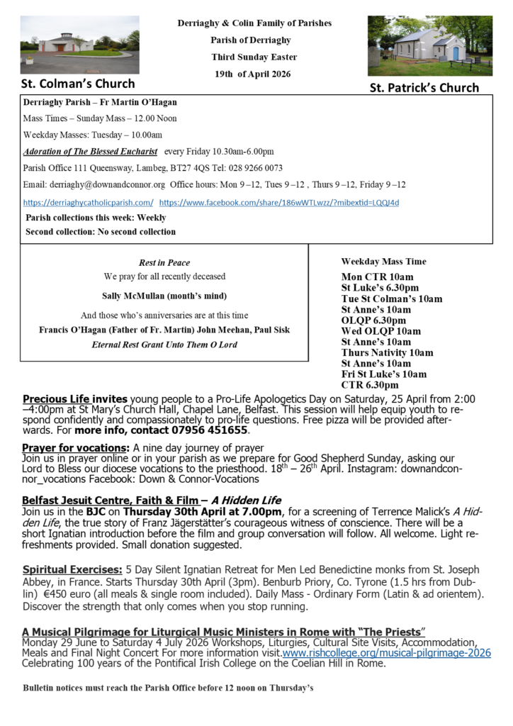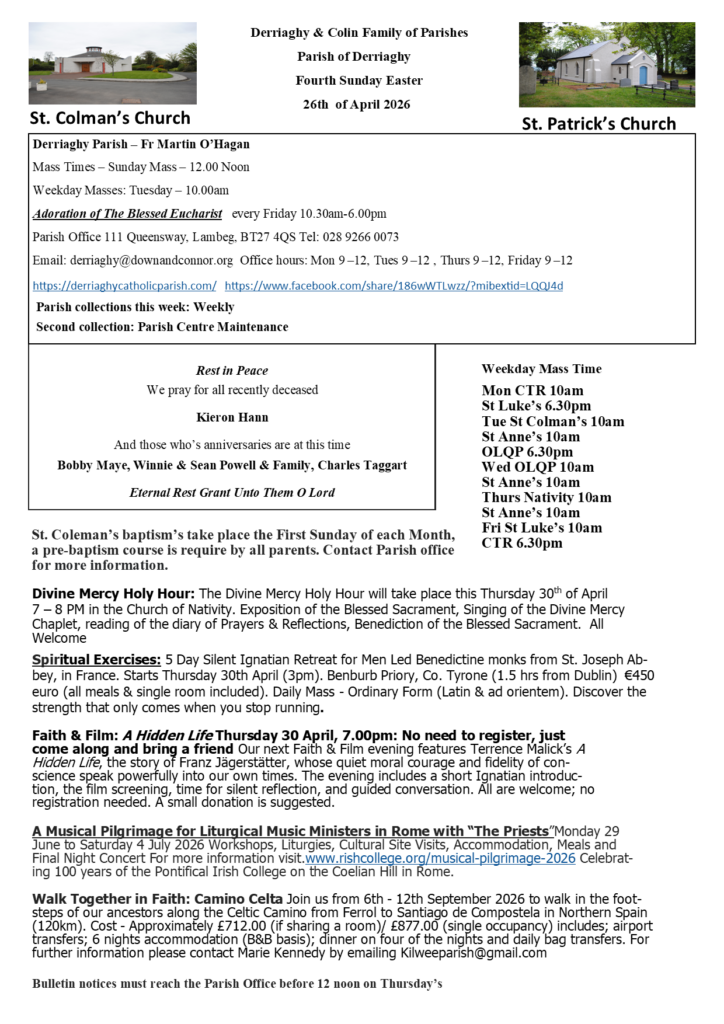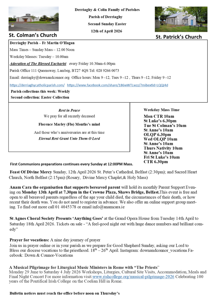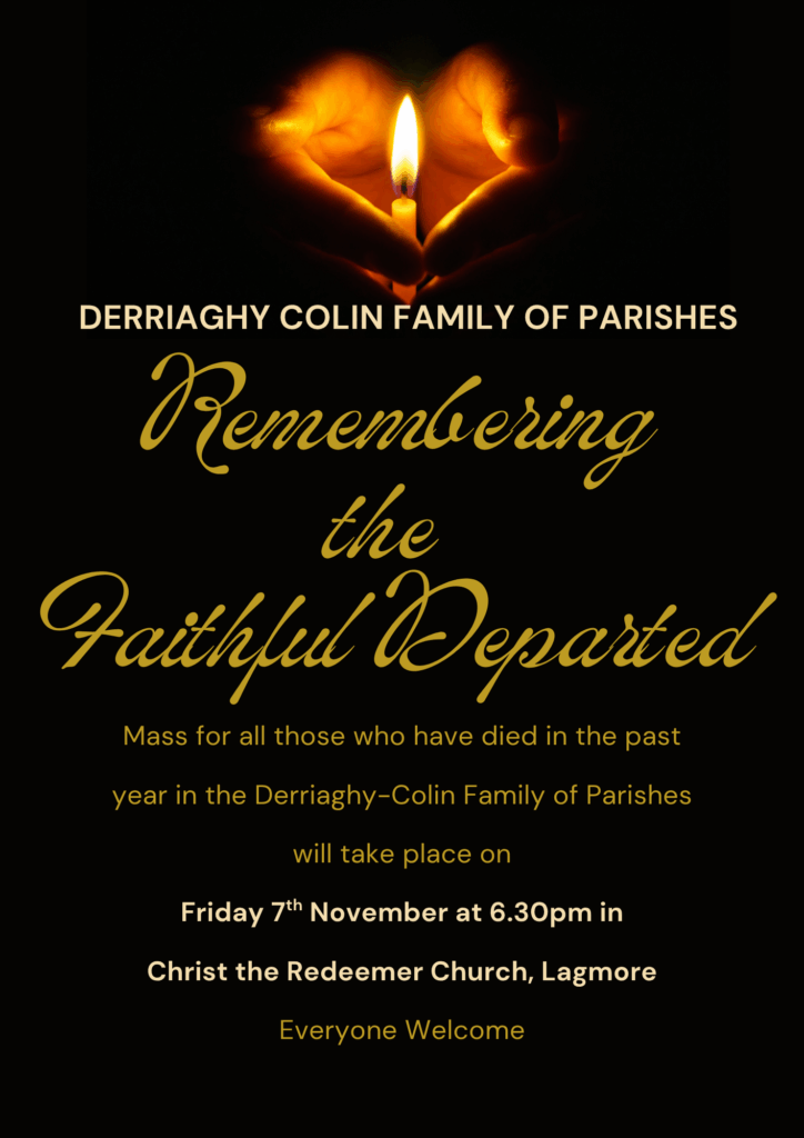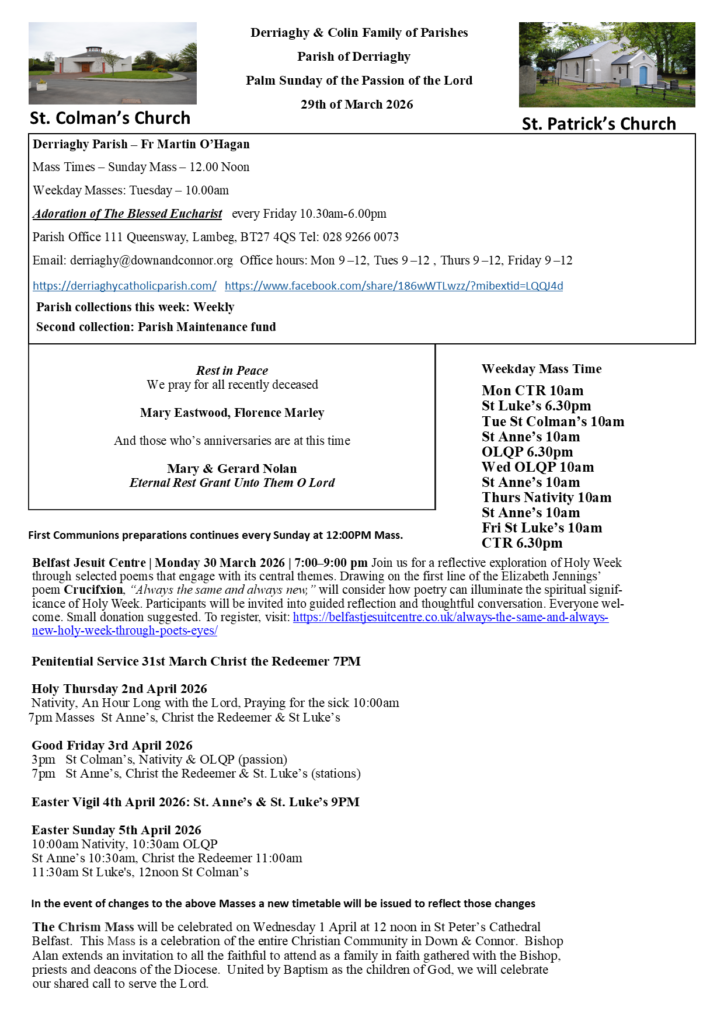- Welcome to the website of Derriaghy Parish in the Diocese of Down and Connor. Derriaghy is the oldest Catholic Parish in the Diocese and you can find out more about our history here. The Parish exists within the wider Derriaghy-Colin Pastoral Family of Parishes.